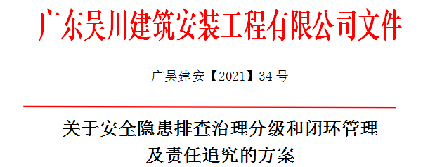 為建立安全隱患排查治理長效機制,強化安全生產(chǎn)主體責任,加強安全隱患治理,防止和杜絕事故發(fā)生,保障施工項目的安全生產(chǎn),現(xiàn)結(jié)合公司的實際,特制定安全隱患排查治理分級和閉環(huán)管理及責任追究的方案。