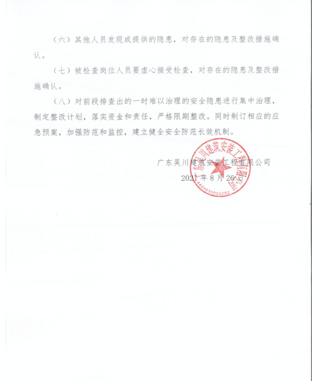 (二)C類安全隱患,項目部按要求責令立即進行整改,由分公司組織項目部進行C類隱患整改最終驗收。驗收合格后報公司質(zhì)安部負責人簽字銷號。