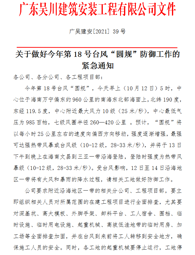 關于做好今年第18號臺風“圓規”防御工作的緊急通知